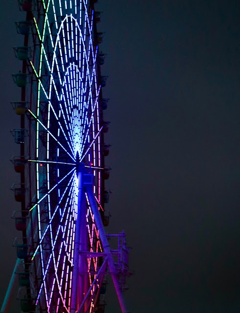 Today was not one of those days, it was well into the night when it came time to leave for the station. And today I went to the other side of the bridge, to get a different angle on the waterways, over in front of one of the hotels. I noticed they had some fairy lights in abundance but in the end was struck by the reflections of the wheel...remembering that the wheel is due to come down soon, so why not another angle?